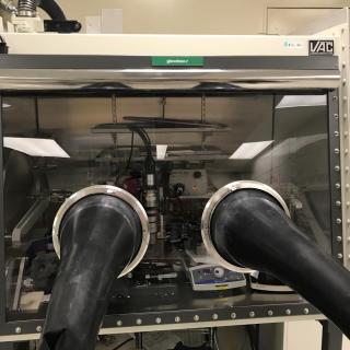 A custom-built, dual-chamber N2 glovebox for sample preparation and spin-coating at reduced oxygen and moisture content. The right one presently has a transfer station and dual hot-plate/stirrer setup with stands for supporting glassware. Custom setups may be accommodated, with prior approval from staff.