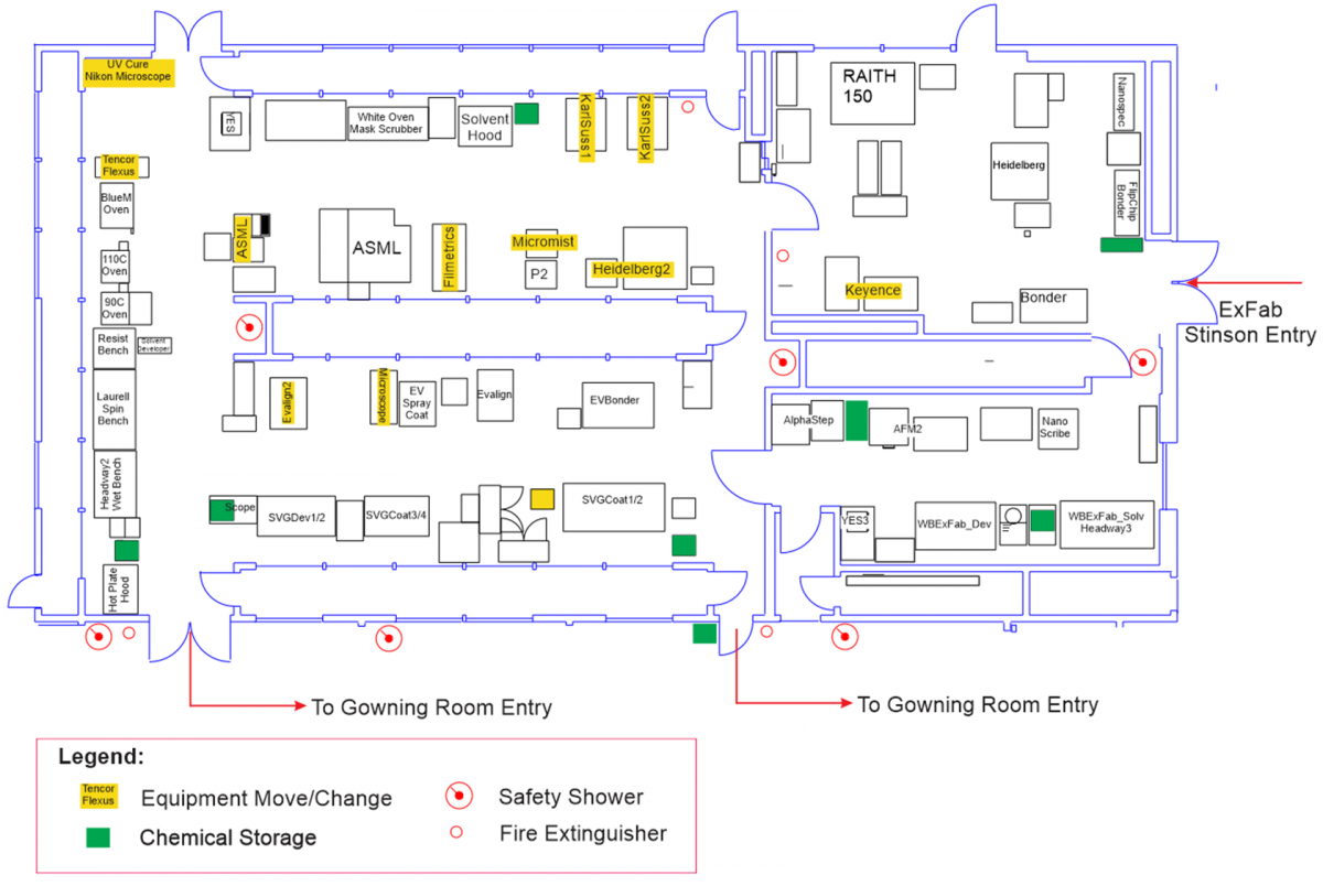 The main changes are discussed below and following is a list of operator stations, meaning locations that provide a 6’ distance from other positions, in an effort to provide our lab members a safe environment to work in. To minimize the need to navigate between the lithography area and the service area we have also added chemical cabinets to support processes in lithography. It is the intent to support all existing processes and maximize the distance between individuals in the facility. As this is a work in progress feel free to offer suggestions as we move forward this summer